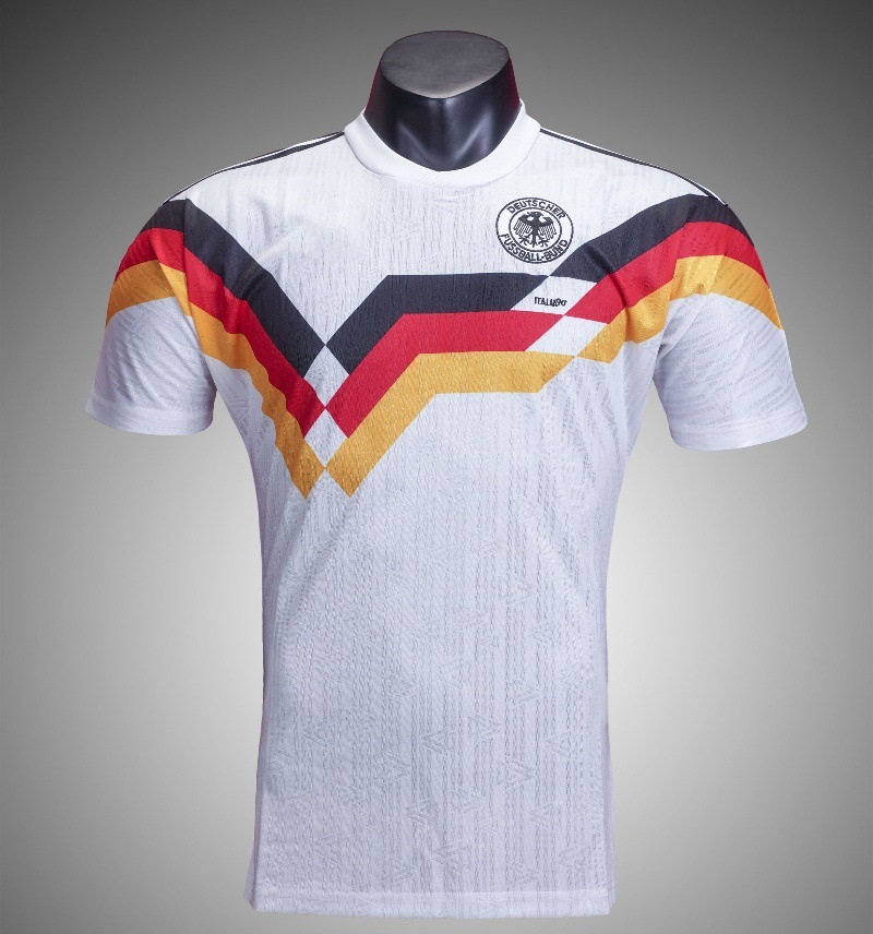 This 1990 Germany home retro jersey revives one of the most beloved designs in football history. Its sharp V-shaped tricolor graphic across the chest delivers instant visual impact, blending black, red, and gold into a bold statement. Paired with a crisp white body and minimalist detailing, the jersey perfectly reflects the spirit and style of early-90s football.