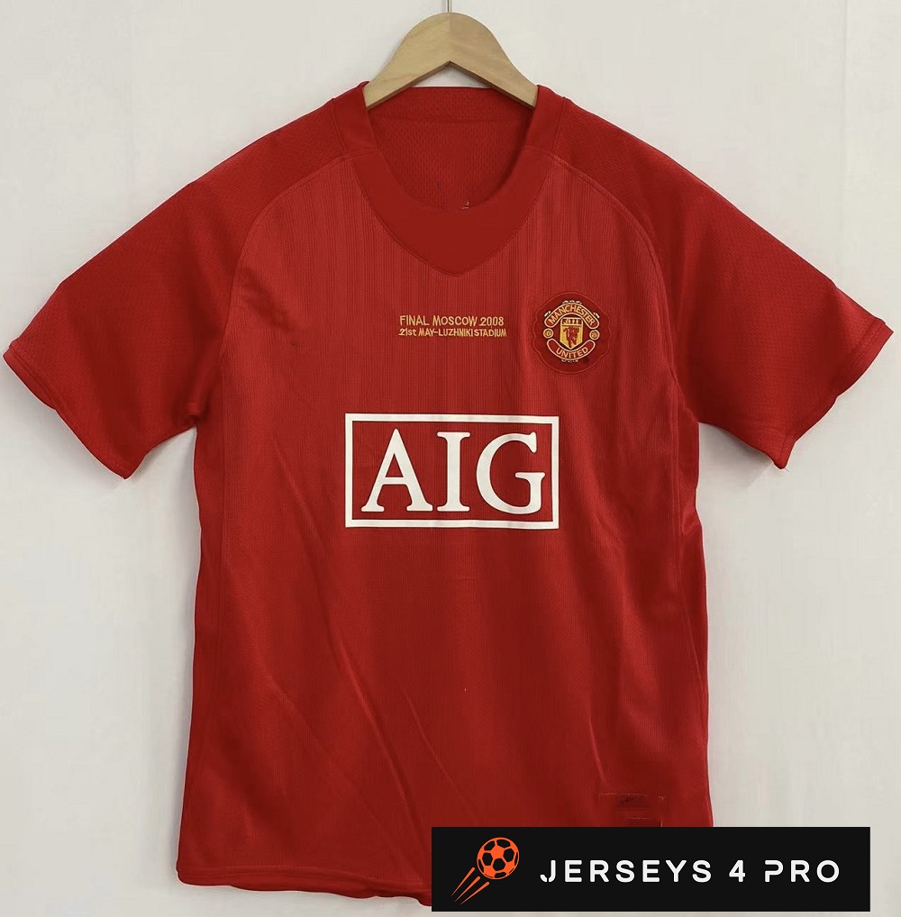 The 2007–08 Manchester United home Champions League jersey is a powerful symbol of one of the club’s most unforgettable seasons. Styled in classic deep red, it features the bold AIG sponsor across the chest and a commemorative gold inscription reading “FINAL MOSCOW 2008 – LUZHNIKI STADIUM” above the crest. This special detailing sets it apart from the standard league version and instantly reminds fans of that iconic European night.