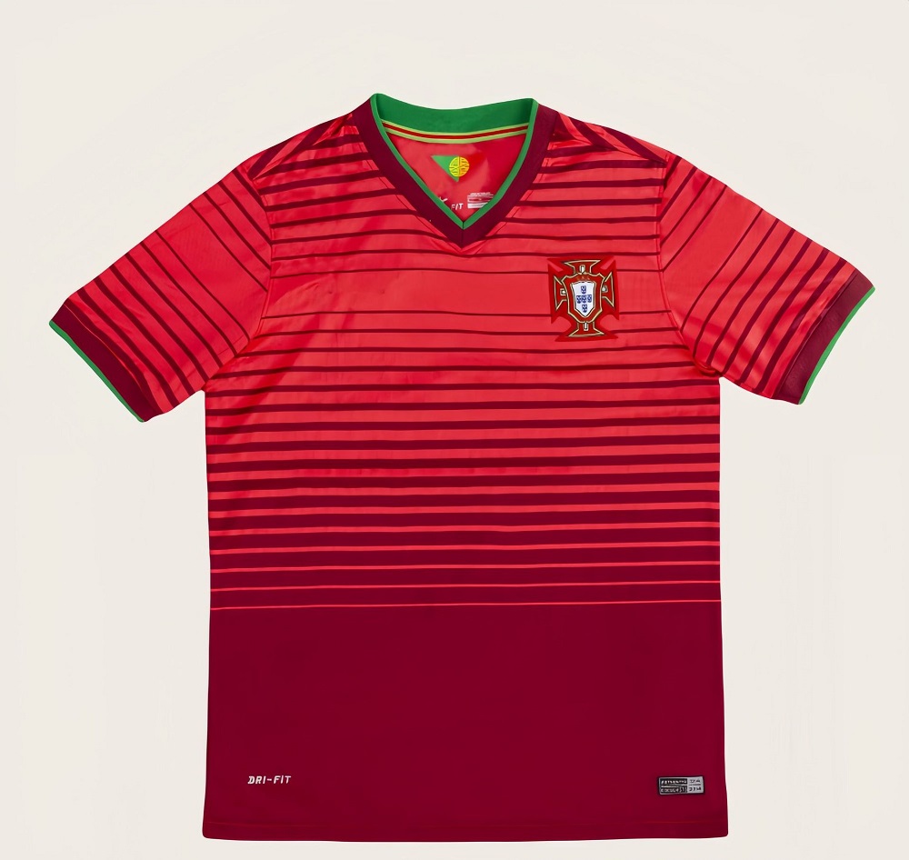 This retro football jersey channels the energy and pride of Portugal’s 2014 campaign. Its gradient red palette and clean horizontal striping create a dynamic look that instantly stands out—bold, modern, and unmistakably tied to the era. The chest carries the team crest with its rich colors and detailed borders, adding a proud finishing touch.